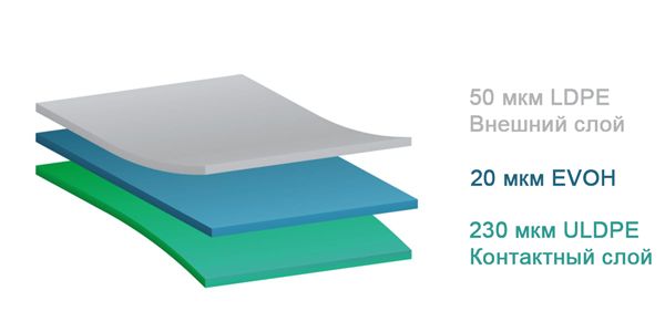 Пленка обеспечивает исключительную совместимость, высокую прочность и превосходный барьер для кислорода, углекислого газа и влаги. Контактный слой изготовлен из полиэтилена сверхнизкой плотности, который не содержит антиоксидантов, пластификаторов или клеев.